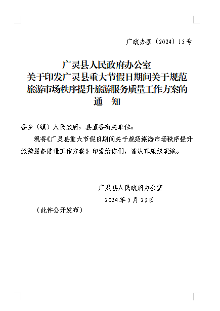 廣靈縣人民政府辦公室關(guān)于印發(fā)廣靈縣重大節(jié)假日期間關(guān)于規(guī)范旅游市場(chǎng)秩序提升旅游服務(wù)質(zhì)量工作方案的通知